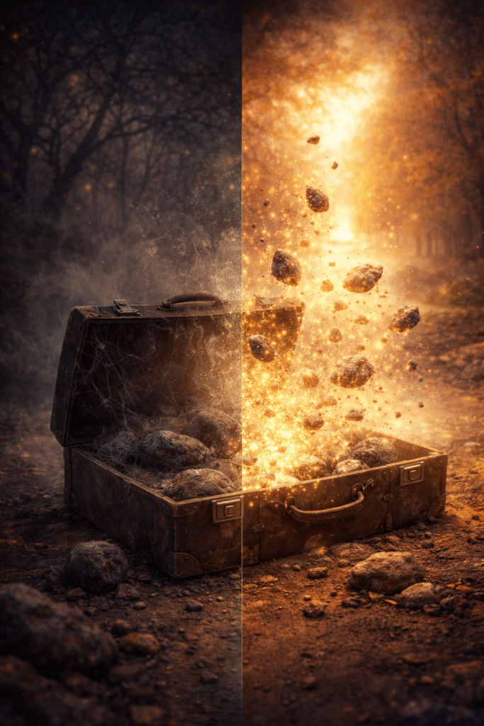 “Es como si llevaras una maleta antigua, sucia, cubierta de polvo, endurecida por el tiempo… y al abrirla descubrieras que no guarda tesoros, sino piedras: memorias que no son tuyas, cargas heredadas, historias que ya cumplieron su ciclo. Y entonces algo dentro de ti se revela… ya no desde el esfuerzo, sino desde la conciencia.